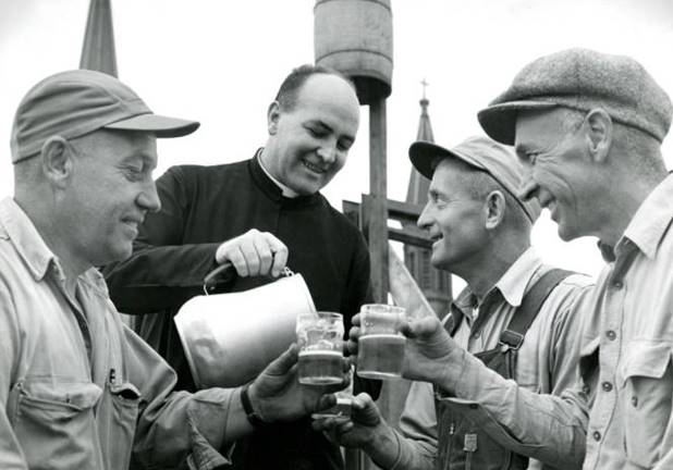 Father Max Barnett, Academic Vice President in 1951, pours refreshment for workers topping out the @MUBusiness building, today’s Straz Hall.pic.twitter.com/3g9vLGzHIC