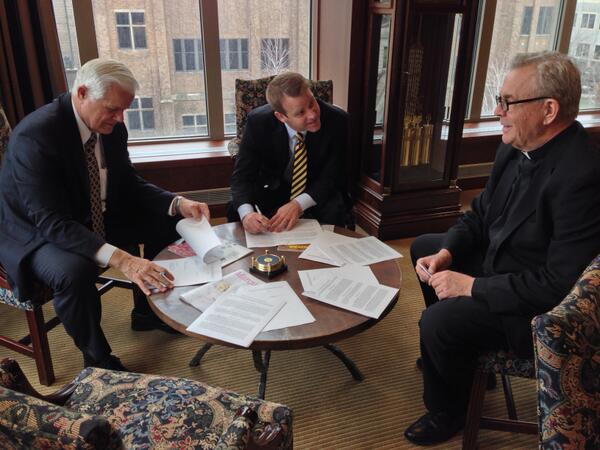 All i's dotted, t's crossed: @steve_wojo formally signs his contract, with Father Wild and AD Bill Cords. #mubbpic.twitter.com/EossSqMN48
