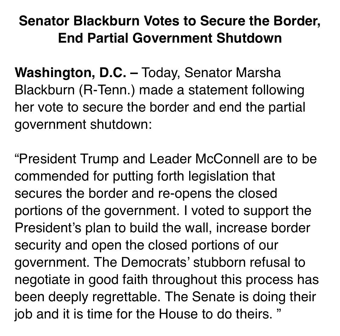 As a Tennessean, I disagree with your belief that spending billions on a wall is an effective way to protect our state. Open the government without the wall!!
