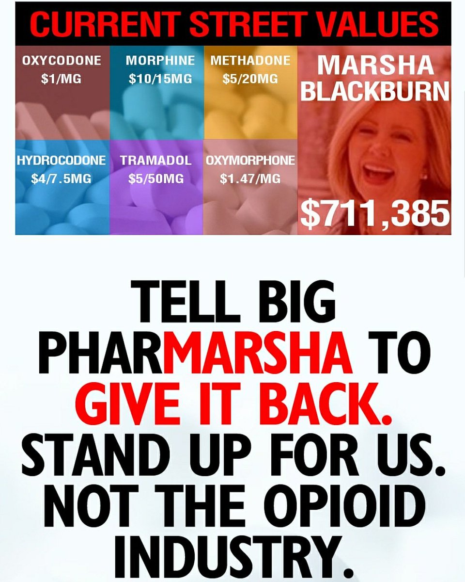 Why don't you give back your campaign contributions from the opioid industry? http://www.marsha.forsale