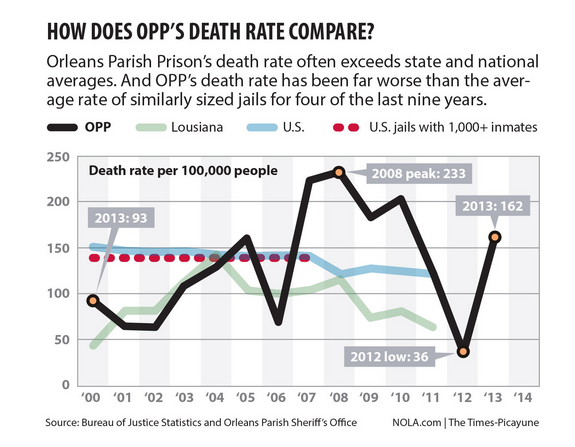 How Orleans Parish Prison's death rate compares to the U.S. average http://bit.ly/1t3aKNs pic.twitter.com/CR5ObyvGEE