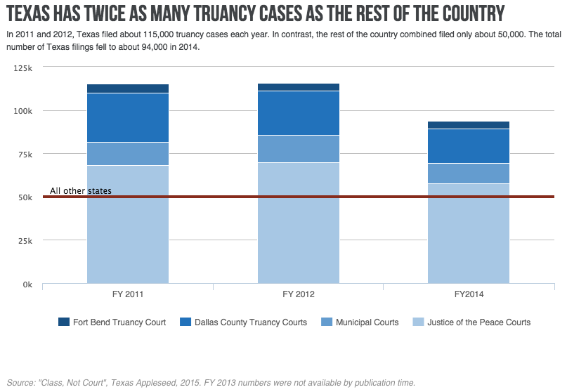 Texas filed 115,000 truancy cases in 2012: twice as many as the rest of the states combined. http://america.aljazeera.com/articles/2015/5/21/in-texas-courts-turn-truancy-cases-into-cash.html …pic.twitter.com/2N9tVrFnqA