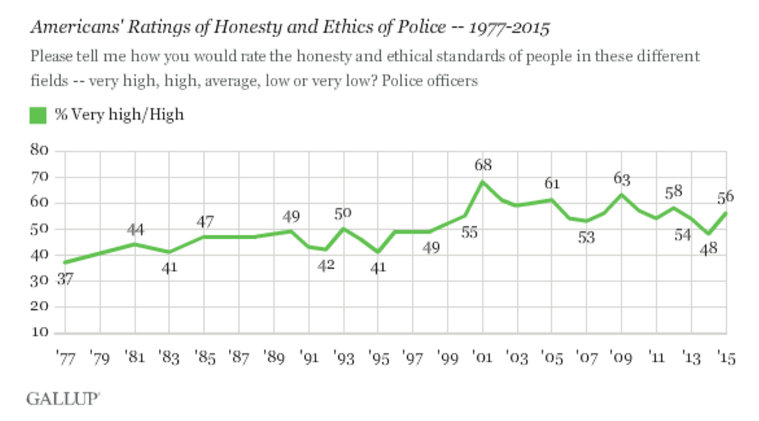 Americans' faith in honesty and ethics of police rebounded in 2015, according to Gallup. http://bit.ly/1moV6fL pic.twitter.com/TRyeOyOyLU