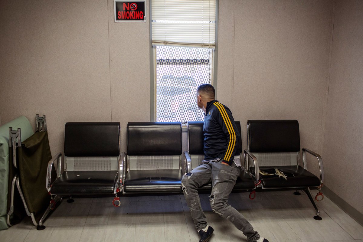 Asylum seekers attempting to communicate with officials. Children waiting to be detained. Migrants awaiting deportation in shackles.