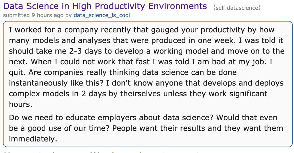 How to train a model in two days: - 1.95 days on data cleaning and ETL. - 0.05 days on a totally naive linear regression because fuck it.https://twitter.com/vboykis/status/1210752792375087104 …