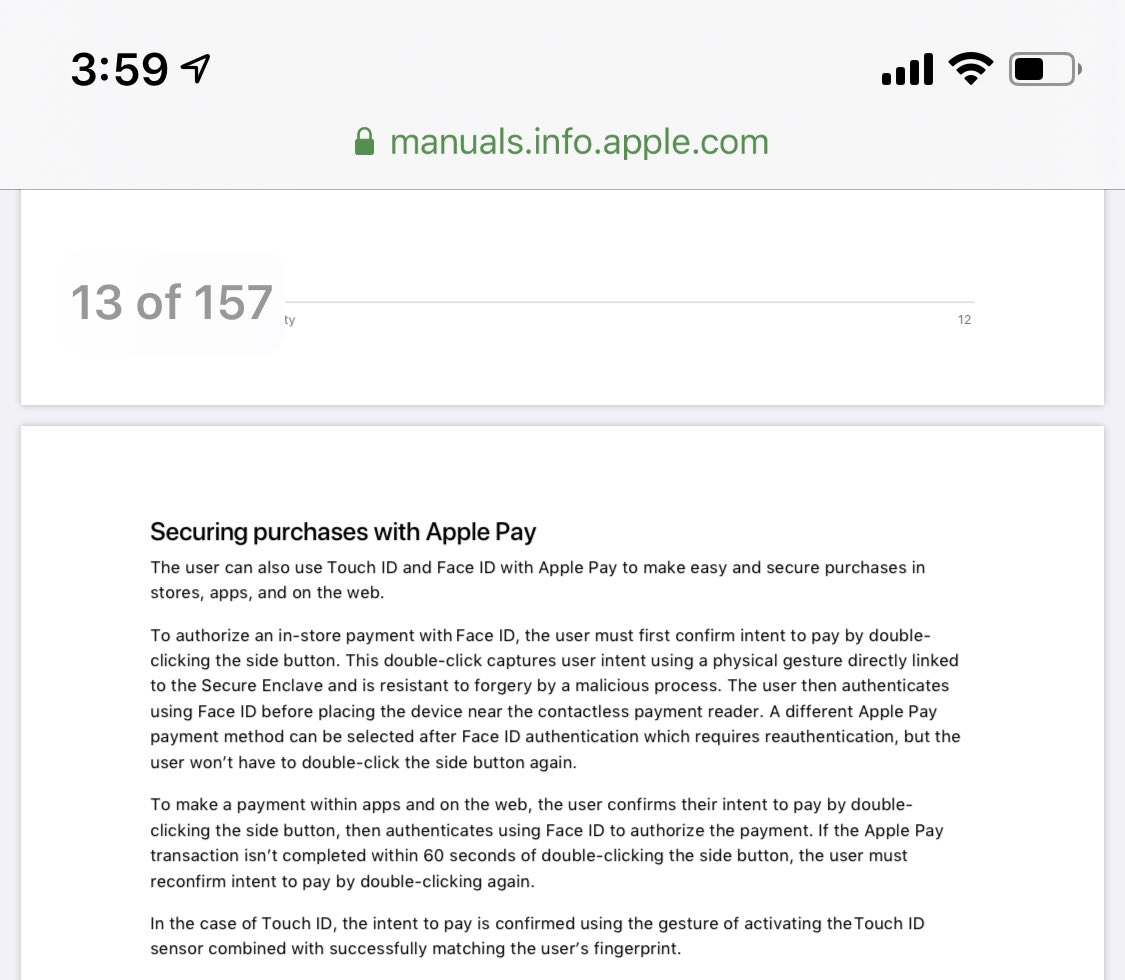 fun fact: double clicking the side button is not just a quick gesture to use apple pay — it’s how we determine your intent (that you actually wanted to initiate a payment). since it’s hardware based, it can’t be hacked in the way that software can be. https://twitter.com/Techmeme/status/1208171974192762881 …pic.twitter.com/BJLj7YzpGc