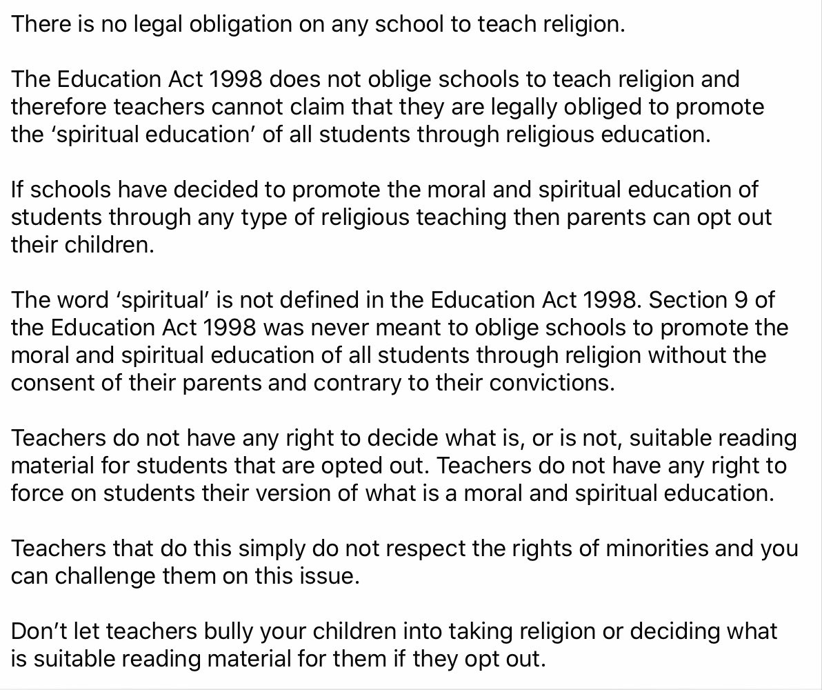 Don’t let teachers undermine the right of your child to not attend religious teaching. If you manage to opt out your child don’t let teachers decide what is, or is not, suitable reading material for your child. They have no right to do this and are undermining your rightspic.twitter.com/gozEawJucl