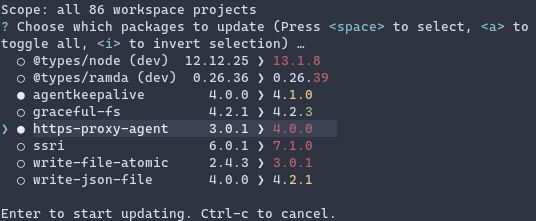 Interactive update is coming soon to pnpm! And it will support monorepos as well