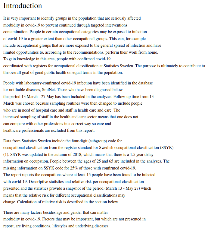This document does include a basic description of methods (under sections "Sammanfattning" and "Introduktion") https://www.folkhalsomyndigheten.se/contentassets/5e248b82cc284971a1c5fd922e7770f8/forekomst-covid-19-olika-yrkesgrupper.pdf … Are there specific things you are looking for that we could try to get to the bottom of?