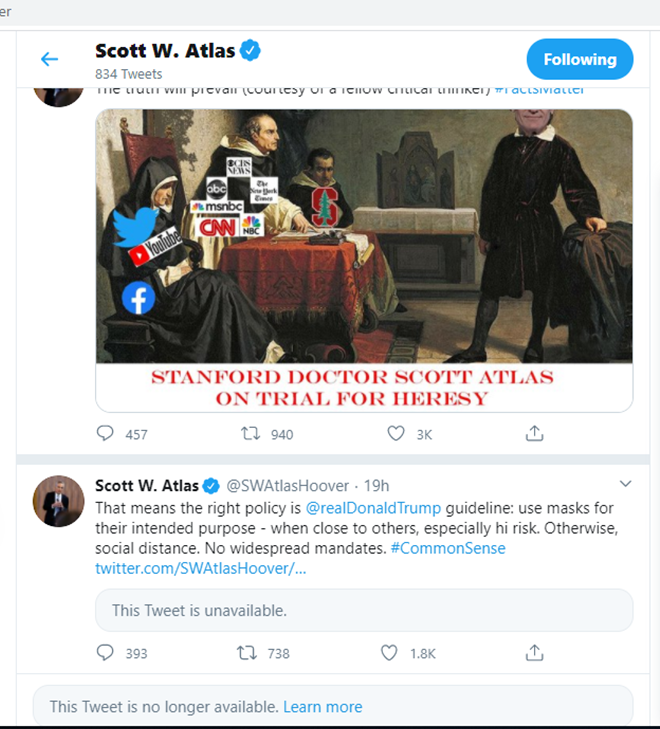 Twitter has censored two tweets by scientist and White House Coronavirus Task Force member @SWAtlasHoover. After 300 years, the Age of Enlightenment has ended.pic.twitter.com/Q2lFKWnp6z