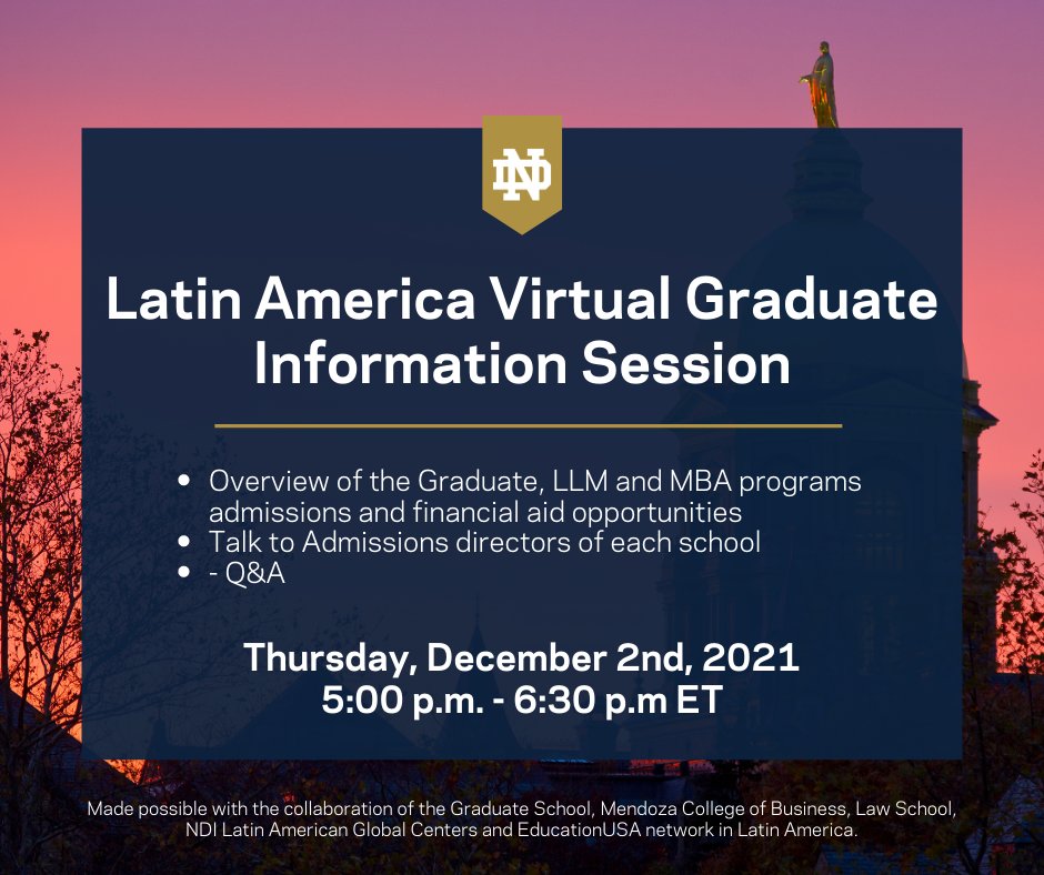 @NDLaw at an online information session next week. Current Notre Dame students from Latin America will join the session to share their ND experiences. Register here: https://international.nd.edu/events/2021/12/02/latin-america-virtual-graduate-information-session/ …pic.twitter.com/jKx2nhbzMp