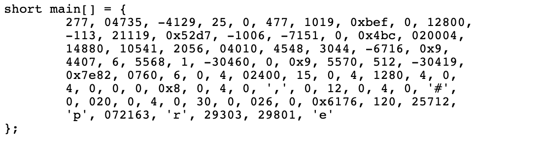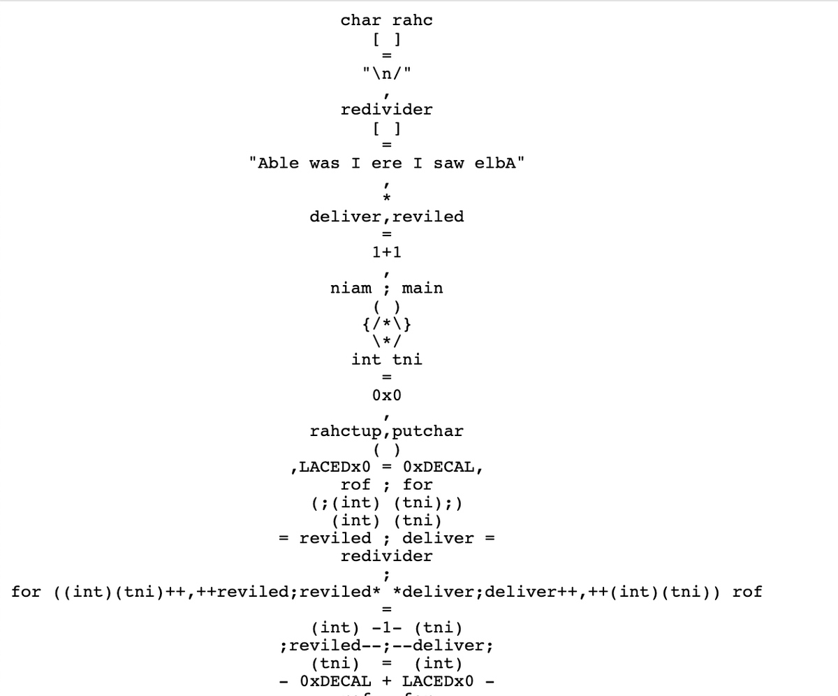 So someone was saying that after seeing this C++: [[]]([]()[[]]{}={})(); from here: https://twitter.com/shafikyaghmour/status/1128790426519871496 … said that they would they “would stick to C, thank you very much”. I have to wonder have then seen IOCCC before: https://www.ioccc.org/years-spoiler.html …