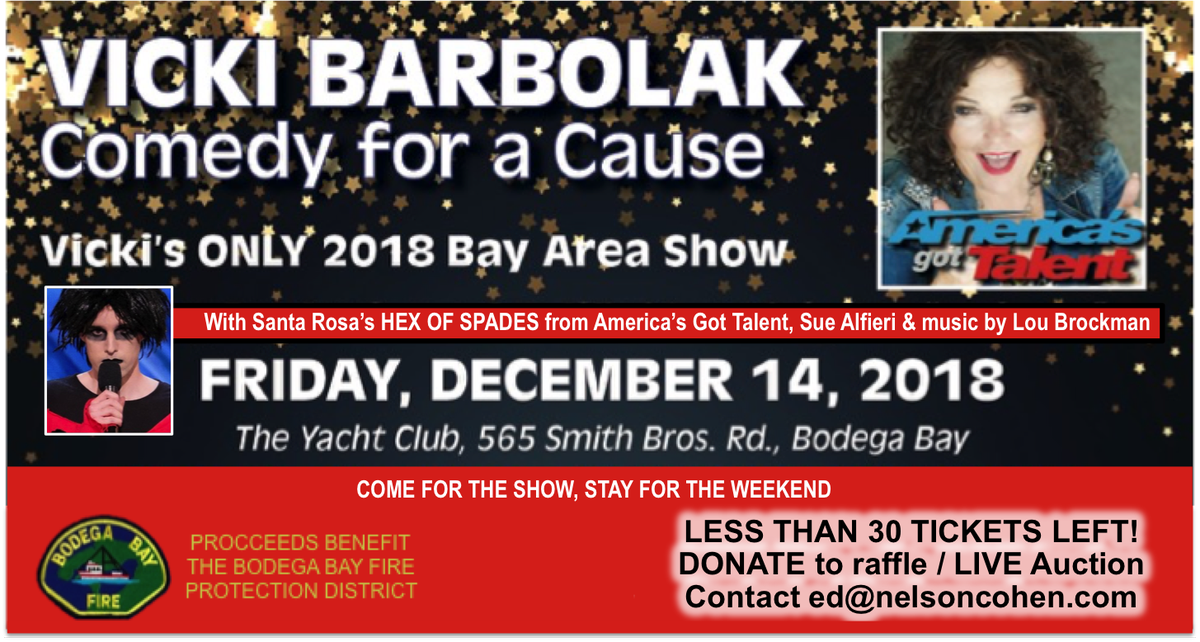 Fires are putting a strain on small town fire departments. That's why I'm doing Comedy for a Cause in Bodega Bay on DEC 14. Come & support the Bodega Bay Fire dept. They are there at every fire and their equipment is wearing. INFO/Tickets: https://www.brownpapertickets.com/event/3796008 pic.twitter.com/DYC4DI2aWC