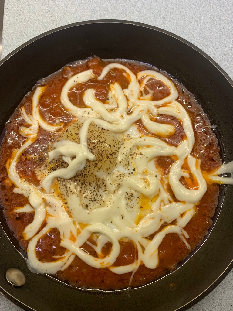 I bought ZonZon shakshuka sauce at the MarVista Farmers market last Sunday, added a duck egg... then I couldn't resist so I topped it with a few strands of brined string cheese and ate it with flatbread. It was a perfect lunch!pic.twitter.com/tE8Naph9sC