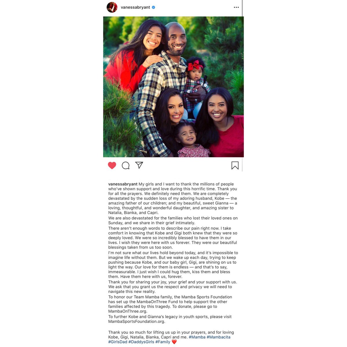Vanessa Bryant’s statement on the passing of her husband and daughter