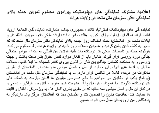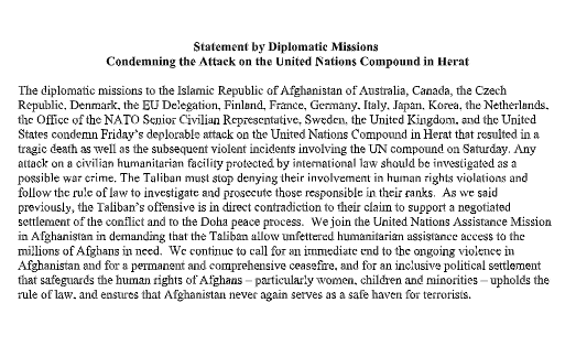 Statement by Diplomatic Missions Condemning the Attack on the United Nations Compound in Herat