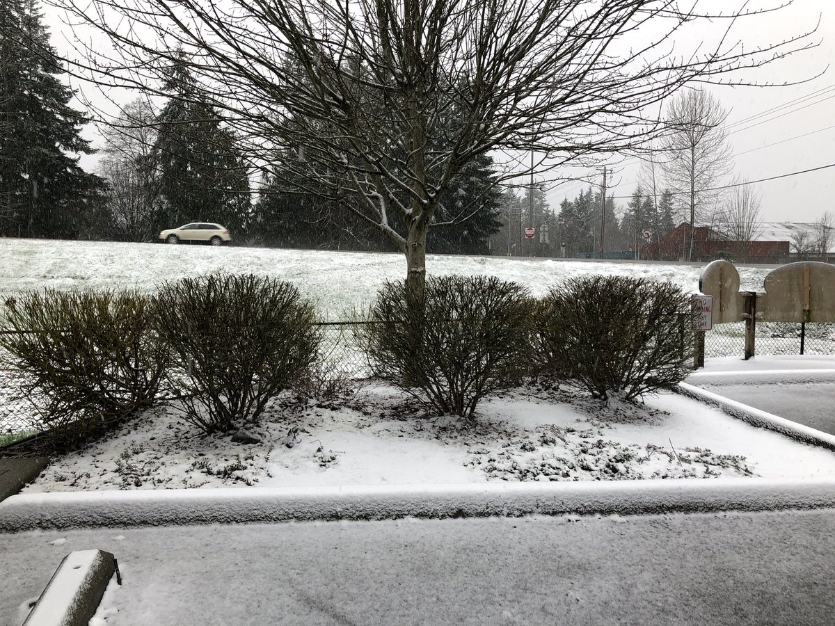 Here is the current situation in west Lake Stevens. Steadily snowing lightly, but it is starting to get heavier. down to 33°F, elevation 350feet. Accumulating on grass, planters, trees, and slushy accumulation on parking lots and some side roads.