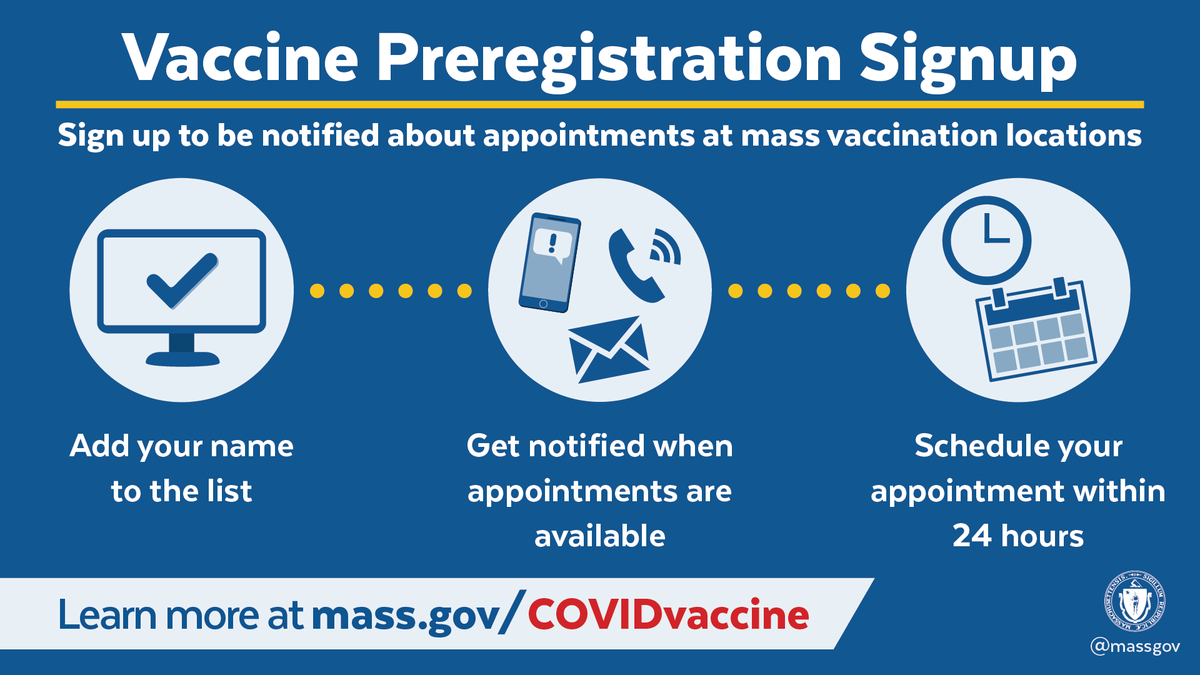 Anyone who lives, works, or studies in Massachusetts is able to preregister for a COVID-19 vaccine. If you sign up, we will contact you when it is your priority group’s turn and we have an available appointment. Learn more: https://www.mass.gov/info-details/preregister-for-a-covid-19-vaccine-appointment …