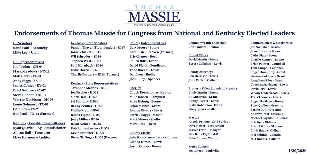Thank you former Congressman Ron Paul and Carol Paul for endorsing me! This weekend, 8 more elected officials in Kentucky signed up to endorse my campaign! If you want to financially support my campaign, you can do so at the link below. (1/3)https://secure.thomasmassie.com/donate