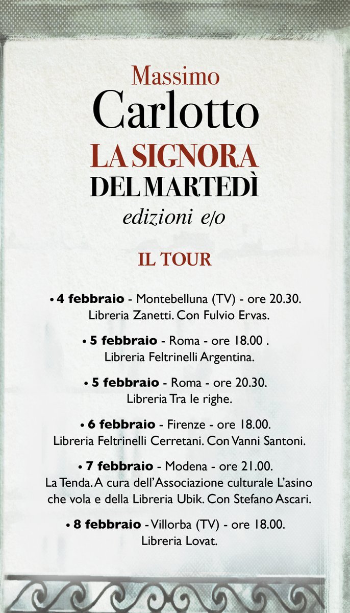 #LaSignoraDelMartedì @EdizioniEO ammirevole come @MassimoCarlotto dispieghi ricchezza e tragedia della vita nello spazio del noir oltrepassandolo e celebrandolo insieme.pic.twitter.com/E7YrMnjdyB