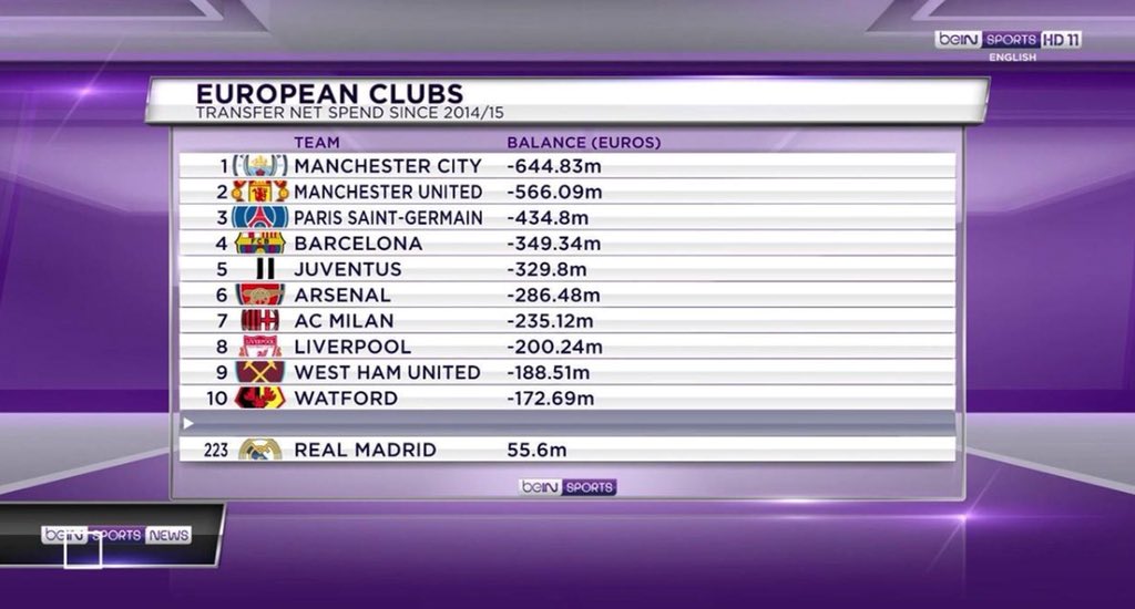 Les clubs européens les plus dépensier : Le Real se trouve à la 223eme position. Le club est en positif de 55.6M€.pic.twitter.com/FlZP9vH1va