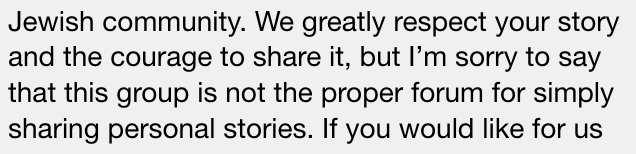 There are those in every community who silence voices of abuse survivors. Moderators of Fbook grp "DC Jew Crew" deleted my video. The group's description: "there aren't any strict boundaries about who should be in the group or what you can post".