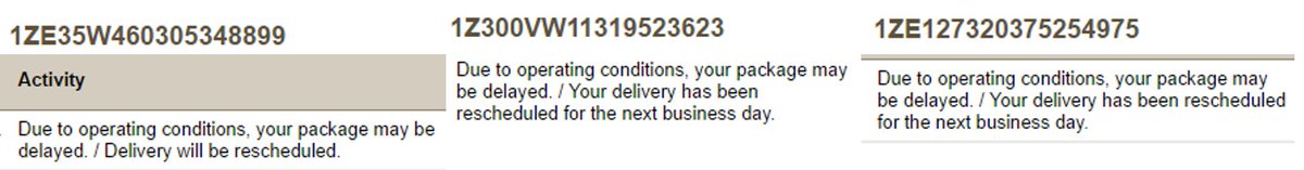 @UPS is NOT the way to go: 3 packages delayed to "operating conditions" - in a state with no weather!pic.twitter.com/0ZSsNqLSBJ