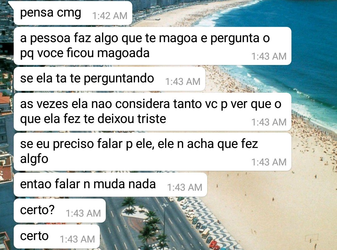 Eu: mãe, você vai no ferrugem? Mãe: vou Eu: e eu? Mãe: vai ficar onde você fica Eu: com você? Mãe: em casa