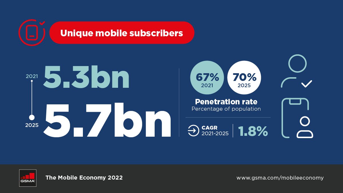 By the end of 2021, 5.3 billion people were subscribed to mobile services, that's 67% of the global population! By 2025 this will grow to 70% of the global population. To find out how mobile is shaping the world, read the