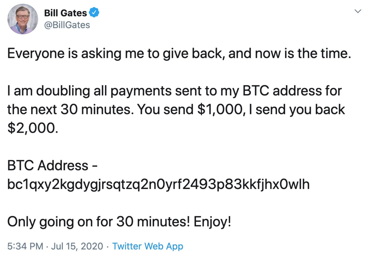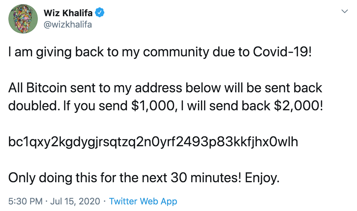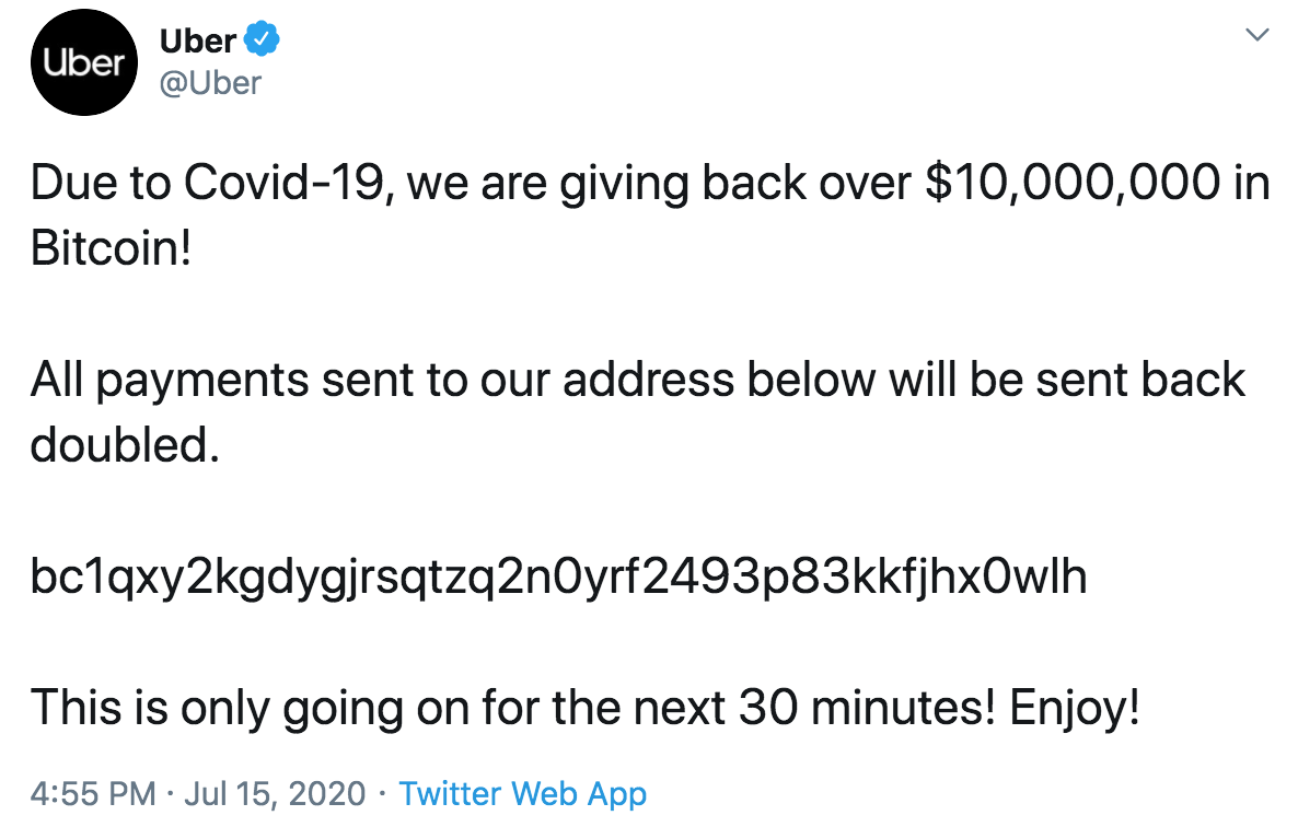 someone has managed to hack a slew of large verified twitter accounts to spread a bitcoin scam. they've made around $56k so far it seems...pic.twitter.com/wjjA7mHqCW