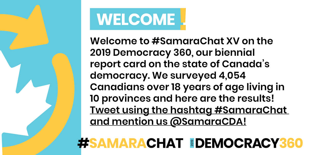 #SamaraChat XV on the 2019#Democracy360, our biennial report card on the state of Canada’s#democracy. To participate, remember to tweet using the hashtag#SamaraChat and mention us@SamaraCDA!#cdnpolipic.twitter.com/2fdQBtuYlD