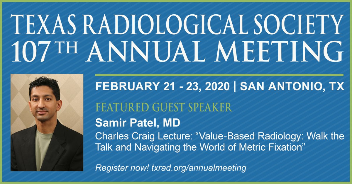 #TRS2020 is proud to have@SamirPatel_MD as a featured guest speaker to give the Charles Craig Lecture on#Value-based#Radiology and#metrics. Join us at the San Antonio Riverwalk in February! Register here: https://www.txrad.org/page/AnnualMeeting …pic.twitter.com/6Yxut7X0U6