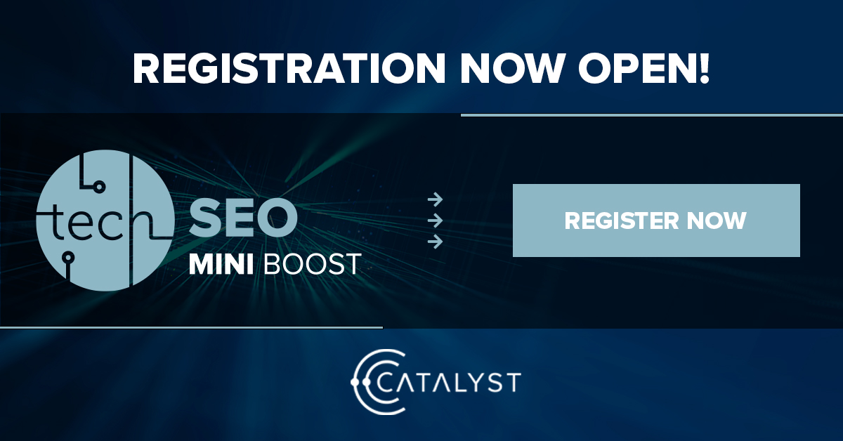 . Registration is open for TechSEO “Mini” Boost! Join Catalyst on 4/22 as we host a free & streamlined virtual experience that includes cutting-edge content from top technical SEOs around the world. Sign up today!