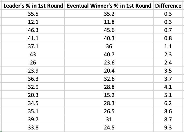 How big of a lead does Adams (or whoever) need to survive the instant-runoff process? @fairvote has tracked 15 come-from-behind RCV winners since 2004, and most were within a few points of the 1st-round leader.pic.twitter.com/hCdDDY67Fo