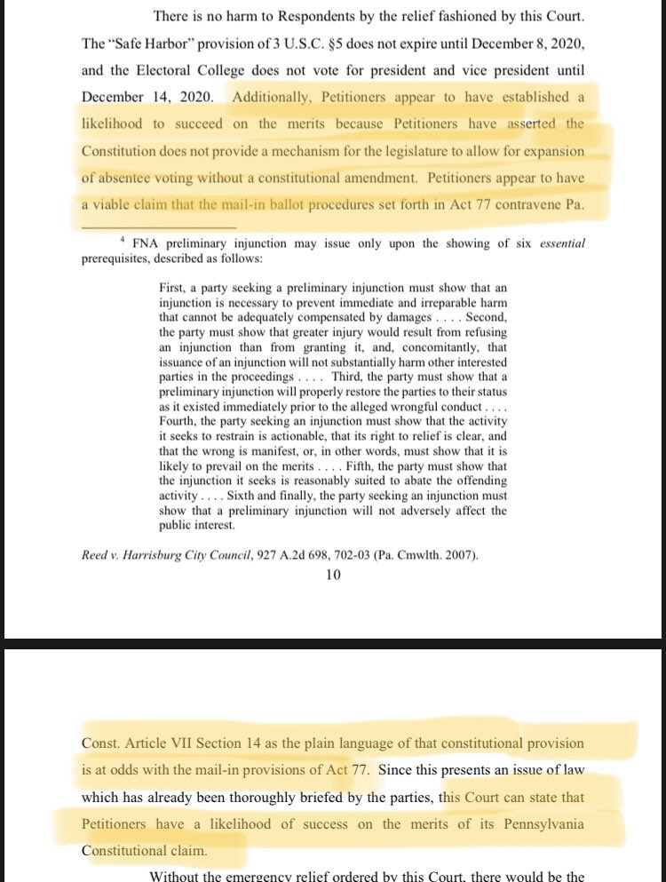 Judge McCullough wrote tonight that petitioners (Rep. Kelly, Parnell, et al) “appear to have established a likelihood to succeed on the merits” and that they have a “viable claim” Act 77 (allowing mail-in ballots) is unconstitutional.pic.twitter.com/9Ozc2eNDZZ