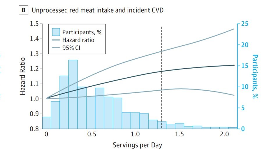 "Intake of... unprocessed red meat (adjusted hazard ratio, 1.03 [95% CI, 1.01-1.06]; adjusted 30-year absolute risk difference, 0.62% [95% CI, 0.07%-1.16%])... was significantly associated with incident cardiovascular disease." hazard ratio = 1.03