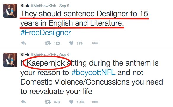 Your sentence, @MatthewKick? 10 years for misspelling "Kaepernick."