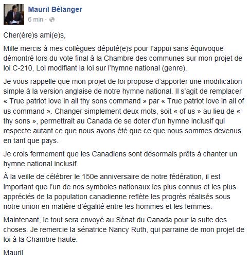 Voici une mise à jour sur mon projet de loi visant à modifier la version anglaise de l'hymne national http://www.mauril.ca/les-nouvelles/