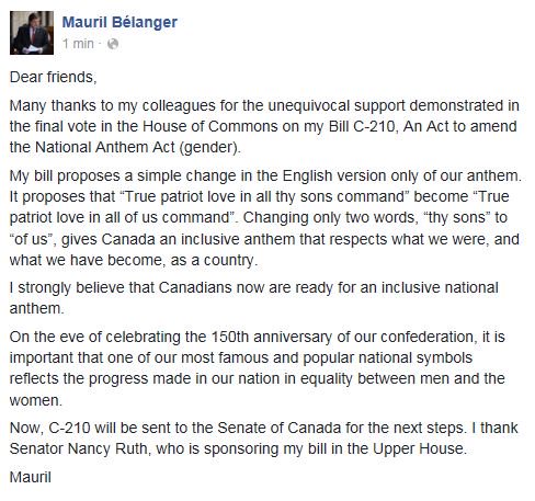 Here is an update on my private members' bill which aims at rendering our national anthem gender inclusive http://www.mauril.ca/news/