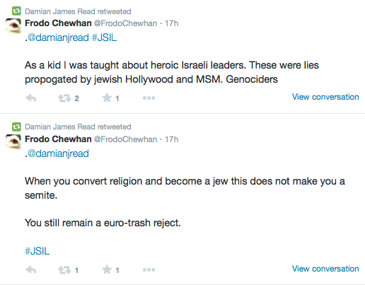 Here are random examples of antisemitic tweets RTed yesterday by @damianjread, whom @MaxBlumenthal follows & promotespic.twitter.com/7wlJgDFXCO