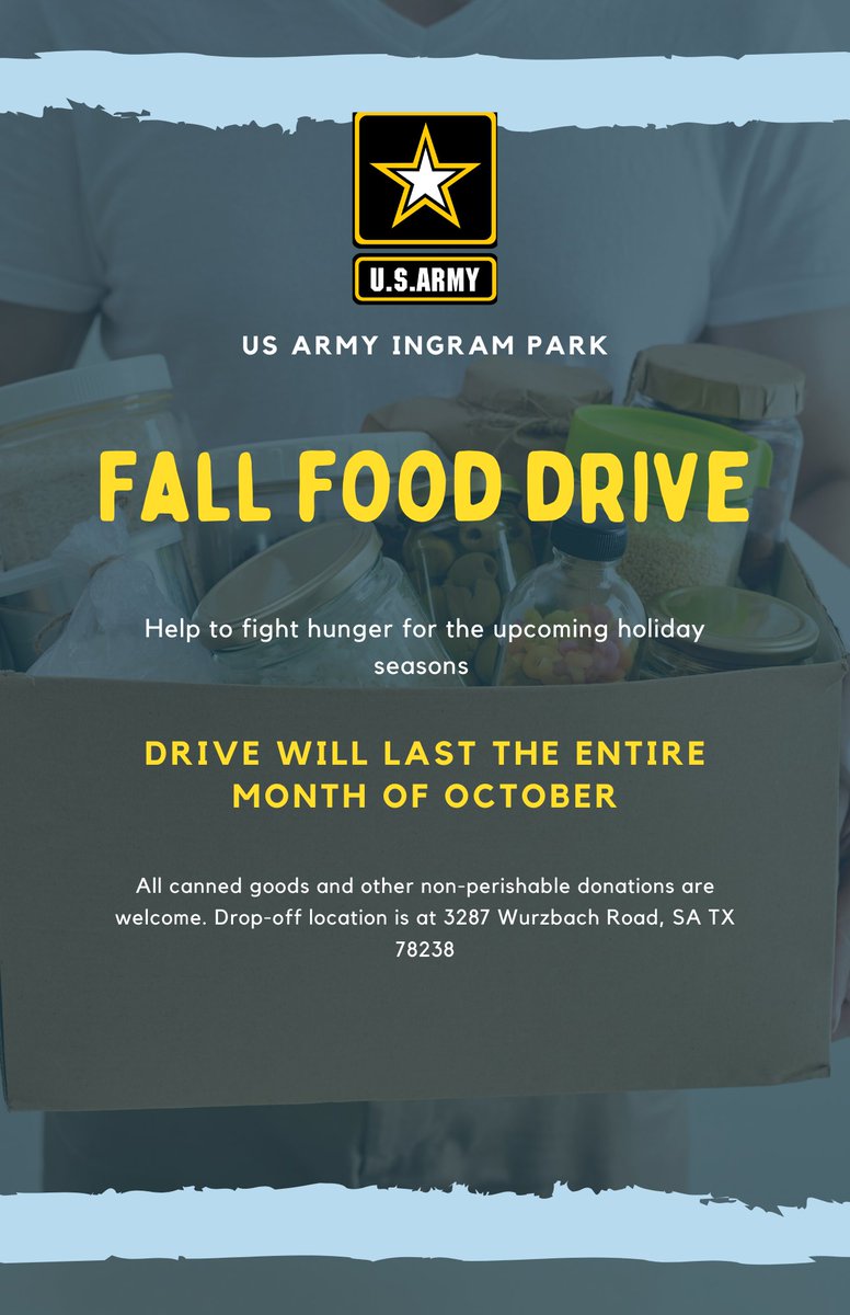 @USArmy and@safoodbank aim to collect 1,000 lbs. of food this October to help feed San Antonio. Drop your non-perishable items at the Army's Ingram Park recruiting office and help make this fall a charitable one.pic.twitter.com/3wXcLnEbbJ