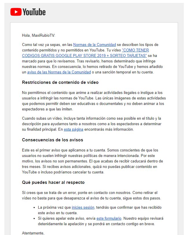 Este es un de los correo que recibí sobre la eliminación de uno de los vídeos. Realmente no infringe ninguna norma de la comunidad.pic.twitter.com/dJRgAaJdme