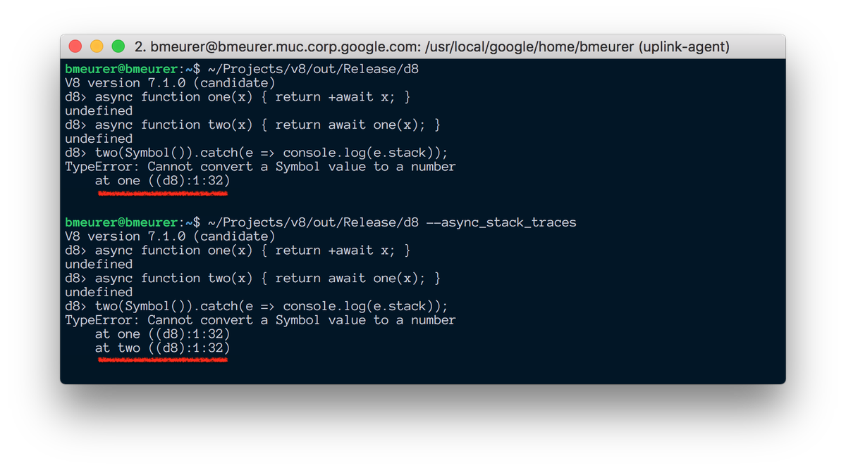 First working prototype of zero-cost async stack traces in @v8js (for async functions). This should make diagnosing production issues in@NodeJS and@GoogleChrome a lot easier once ready.