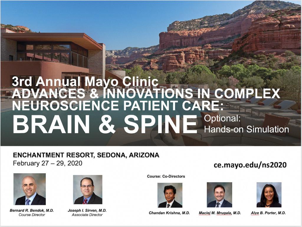 Register for the 3rd Annual Mayo Clinic Advances and Innovations in Complex Neuroscience Patient Care: Brain and Spine 2020 held on February 26-29, 2020 in Sedona, AZ. https://mayocl.in/2NN4pGu pic.twitter.com/EJ8ugALMEa