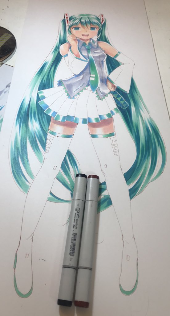 初音ミクさん特大サイズイラスト 背景の着色完了(*'▽'*)!できたっ! アナログ絵は、物質的に大きく描けるのが楽しいです♪pic.twitter.com/aiUME8NWyf