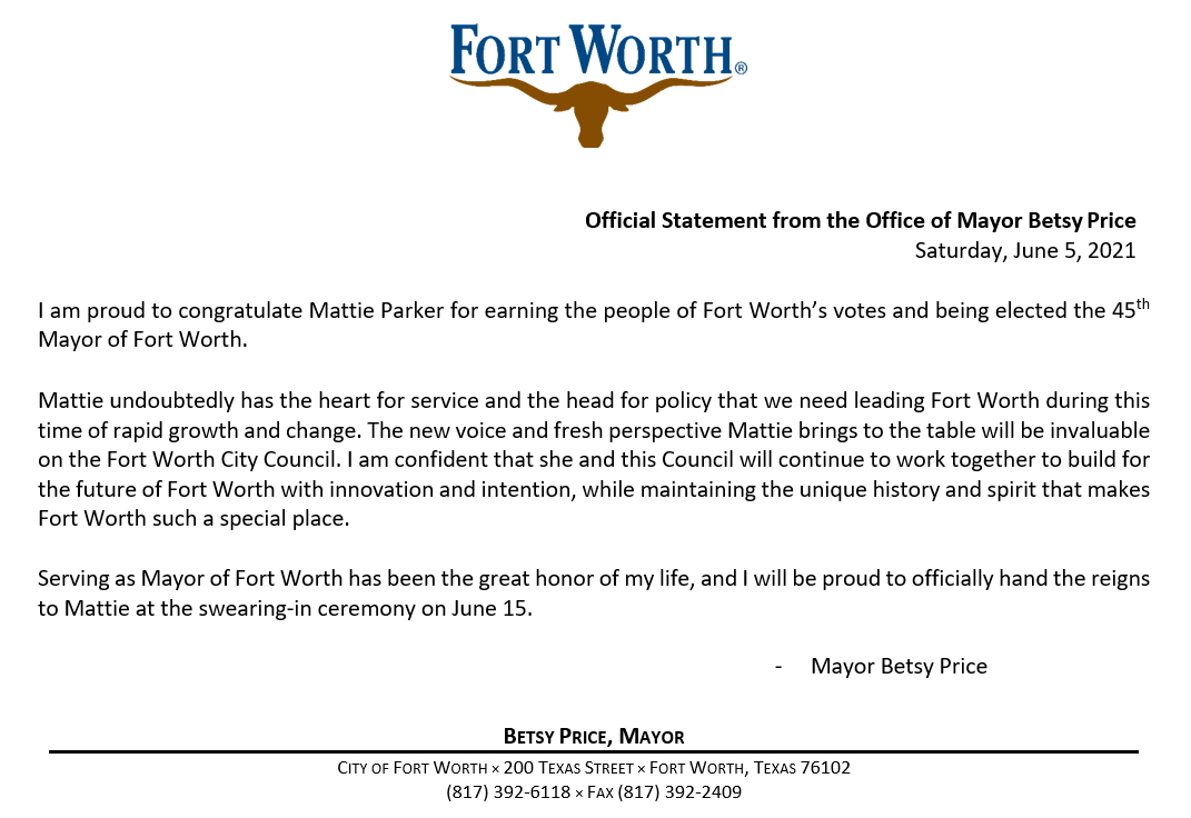 "I am proud to congratulate Mattie Parker for earning the people of Fort Worth’s votes and being elected the 45th Mayor of Fort Worth. (1/4)pic.twitter.com/ud4Snk5ITK