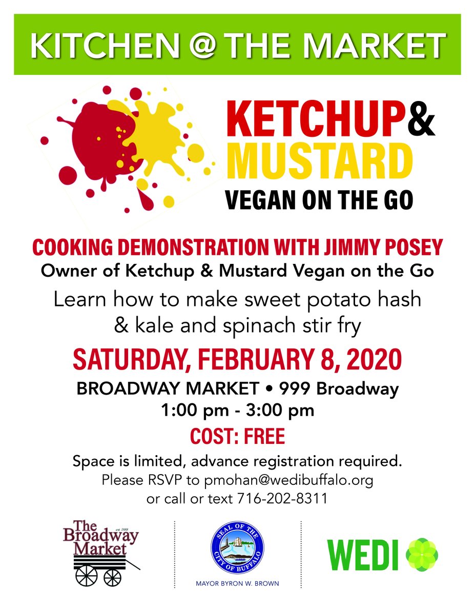 Kitchen @ the Market - Free Demonstration w/Jimmy Posey of Ketchup and Mustard Vegan on the Go - Register by calling or texting 716-202-8311 or emailing pmohan@wedibuffalo.orgpic.twitter.com/B4xbFPyh8E
