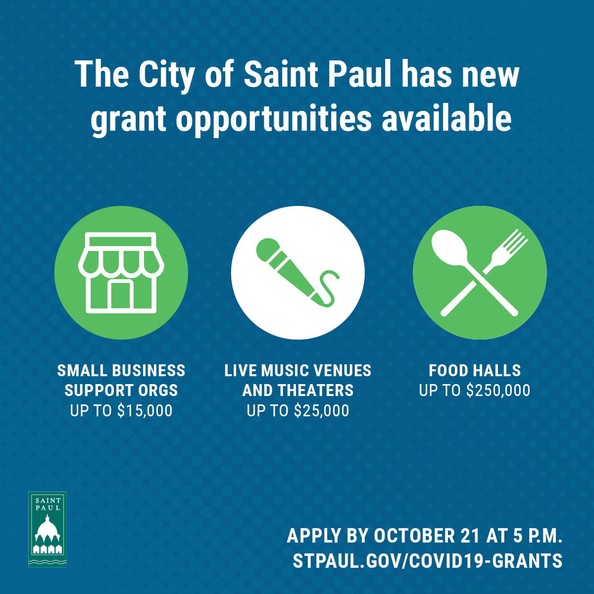 Amid this enduring pandemic, our work to ensure no one is left behind is more vital than ever. These new grant opportunities will help our small businesses and cultural organizations weather these challenging economic times. Apply now at http://stpaul.gov/COVID19-grants .pic.twitter.com/71j9HHBaRX