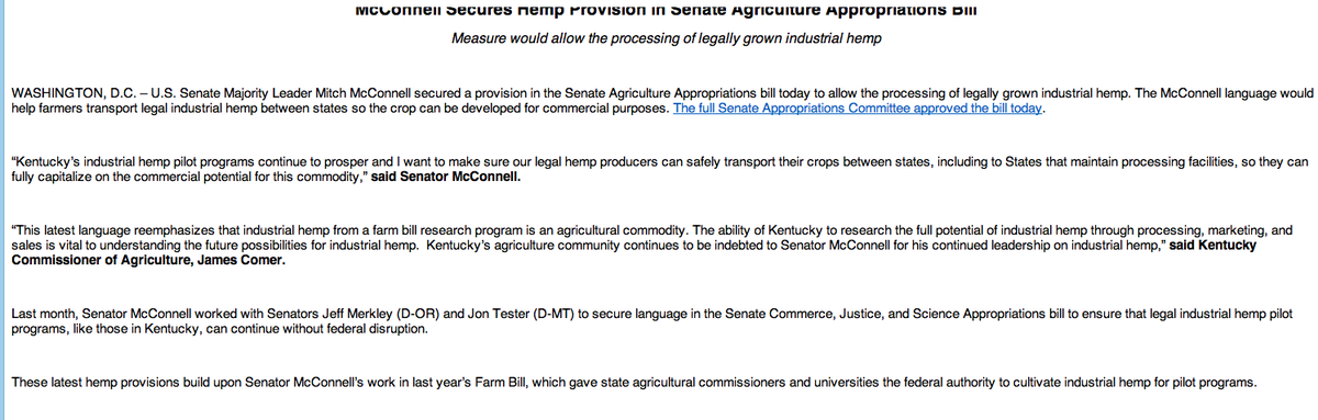Sen. McConnell secures #hemp provision; measure would allow the processing of legally grown industrial hemphttps://twitter.com/bowserminor/status/621709366882766848 …