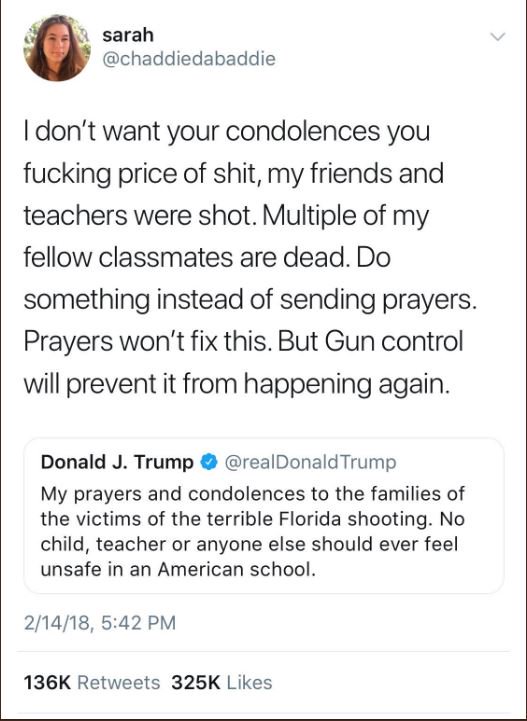 "Thoughts and prayers" do NOTHING. After every shooting you say, "Now is not the time." When is the time? How much more blood on YOUR hands before you do something about the killing of innocent children and citizens.